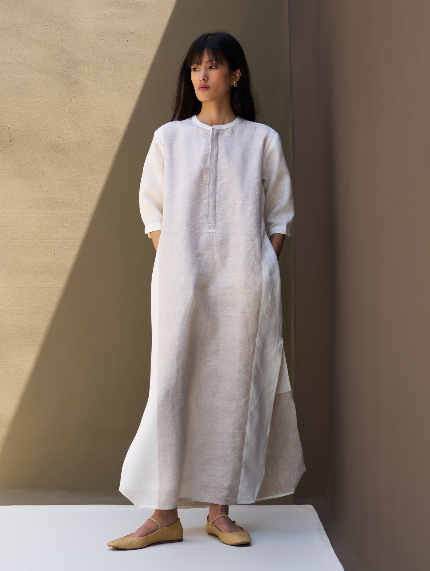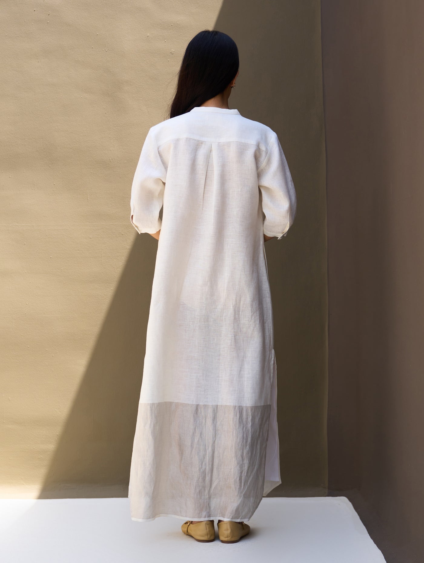 A full-length tunic dress that blends simplicity with subtle luxury. Crafted from our signature handloom metallic linen, this piece catches the light with a soft sheen while maintaining a natural, breathable feel. Featuring a concealed placket with brass buttons, elbow-length sleeves with cuff detail, and high side slits for ease of movement, it’s a versatile staple for both formal and casual wear.