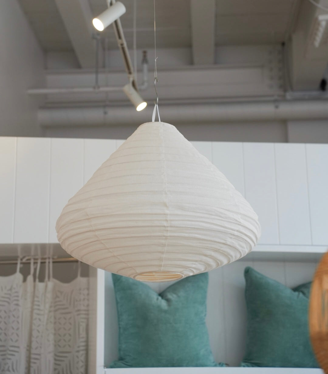 The crisp white fabric gently diffuses light, creating a warm, inviting light while maintaining a fresh, airy aesthetic.