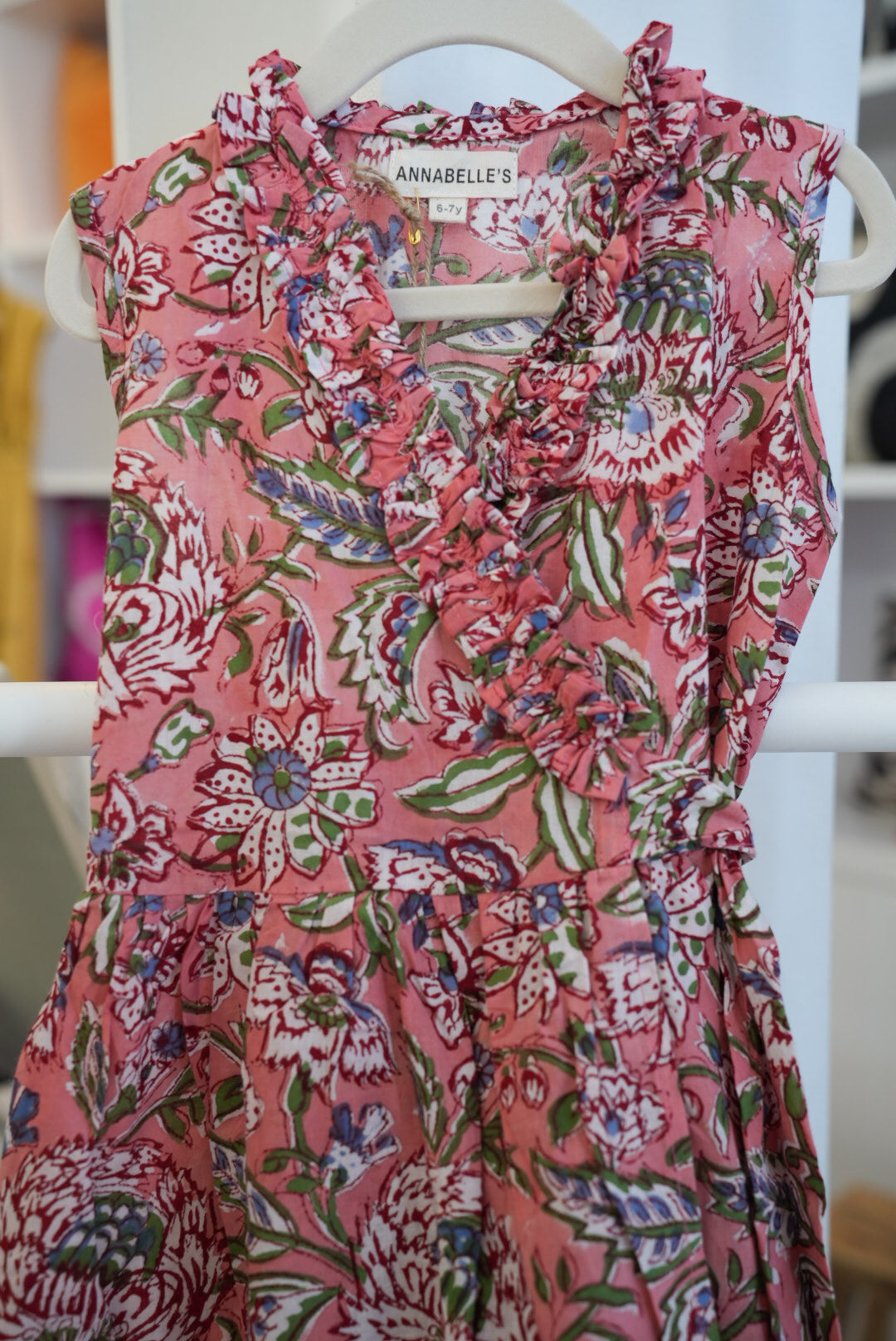 Handmade in Jaipur from soft, breathable cotton, this sleeveless dress features a beautiful hand block-printed floral design with a delicate ruffle trim through the neckline. The gently gathered skirt allows for movement and comfort, while the tie waist at the back gives an adjustable fit as they grow.